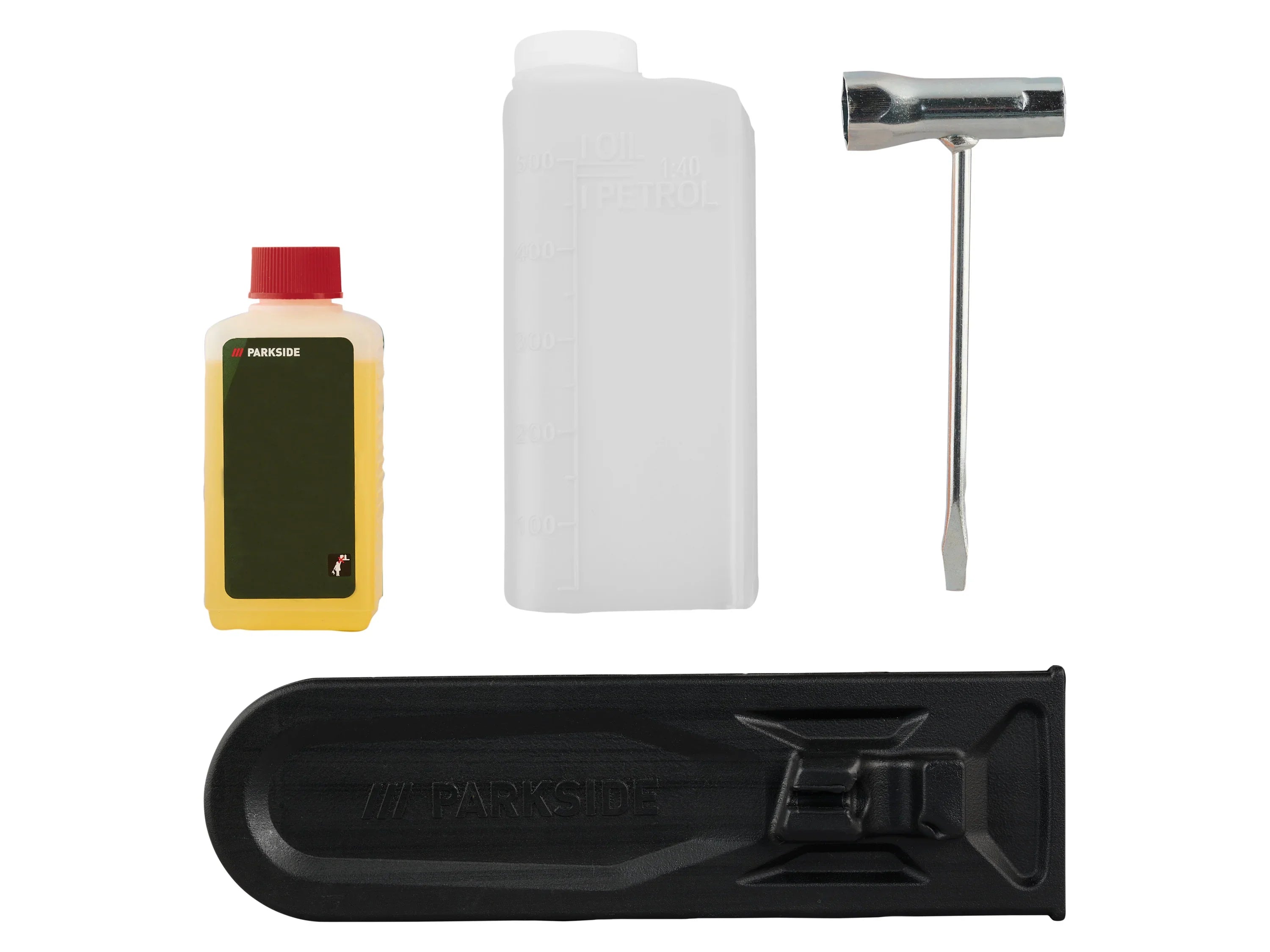 Livrée avec protège-chaîne, outil combiné, bidon de mélange de carburant (500 ml) et 180 ml d’huile de chaîne bio « Made in Germany ».