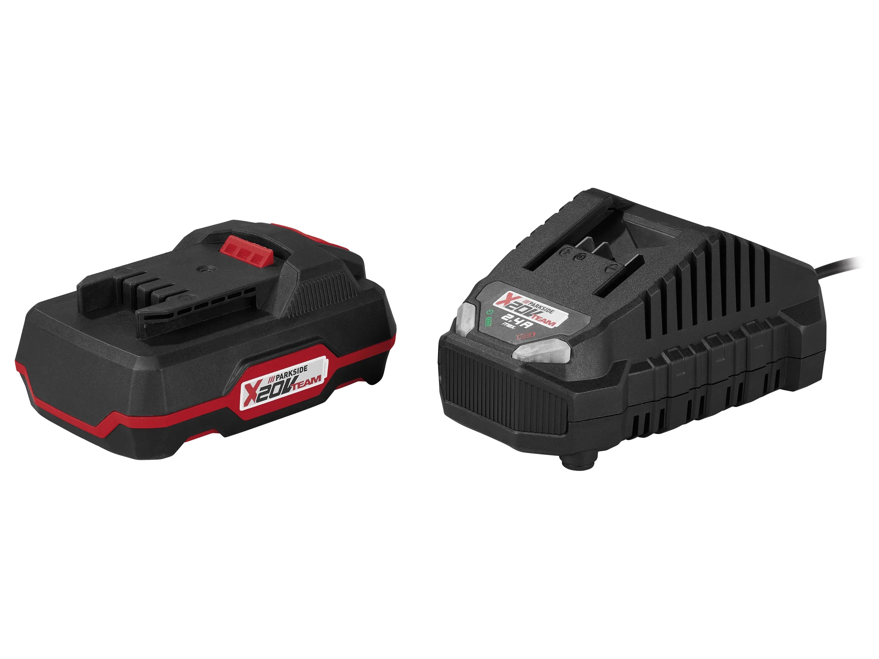 Livrée avec batterie 20 V (2 Ah), chargeur rapide 2,4 A (60 min), casque antibruit, lunettes de protection, housse de protection, outil combiné,